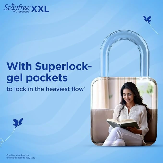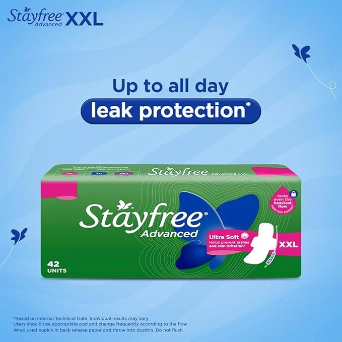 For comfort throughout the day, Stayfree advanced XXL is the ultra pad for you. The soft touch cover helps prevent rashes and skin irritation. So you can keep moving comfortably and protected all day. The blue gel core locks in fluid for the best ever protection and the odour control system helps prevent the foul odour and keeps you feeling fresh.