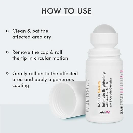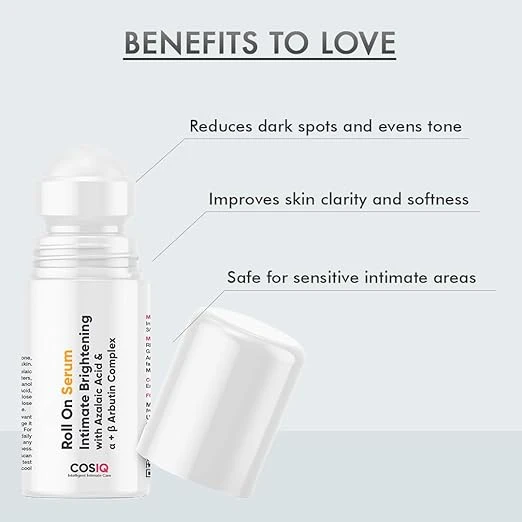 Roll-on serum specifically designed for intimate area brightening, including underarms, inner thighs, knees, and bikini area.