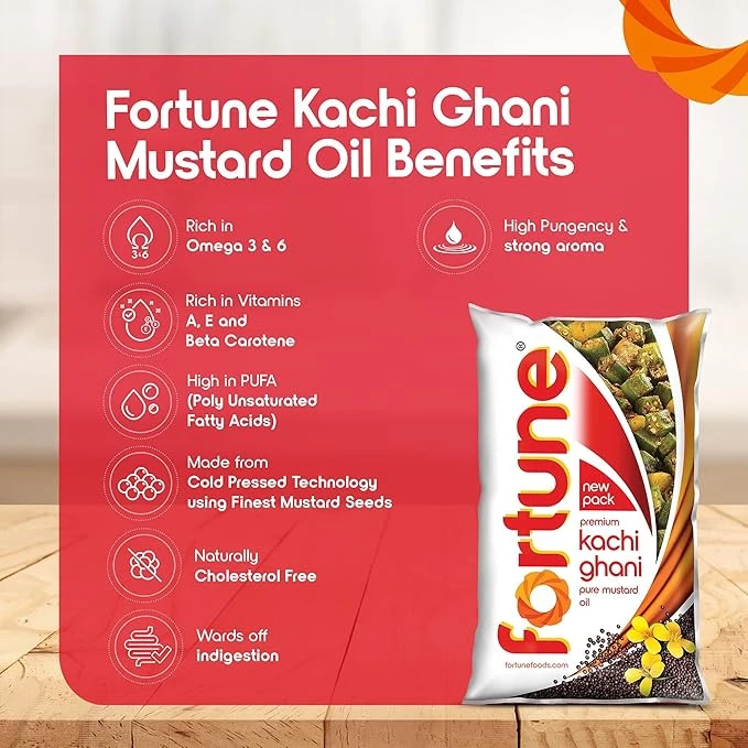 Fortune Premium Kachi Ghani Pure Mustard Oil, traditionally extracted from the first press of mustard seeds, comes with a high pungency level and strong aroma. Being pure, our cooking oil retains its natural properties and mustard oil benefits. Its strong aroma and pungency will spice up your cooking.