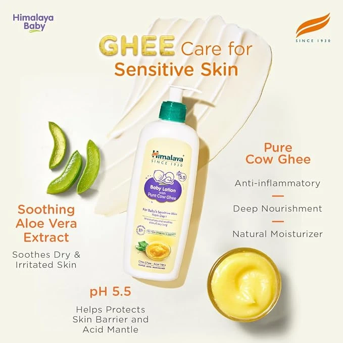 Himalaya Baby Lotion with Pure Cow Ghee and Soothing Aloe Vera Extract is specially formulated to be non greasy and fast aborbent. It maintains moisture all day to nourish, soothe, protect, and improve overall skin condition of your newborn's sensitive skin. Ideal for baby's face and body. What’s Inside: • Baby Lotion with Pure Cow Ghee : Up to 24-hour moisture, All-day protection, Non-greasy (fast-absorbing) for Dry and sensitive skin