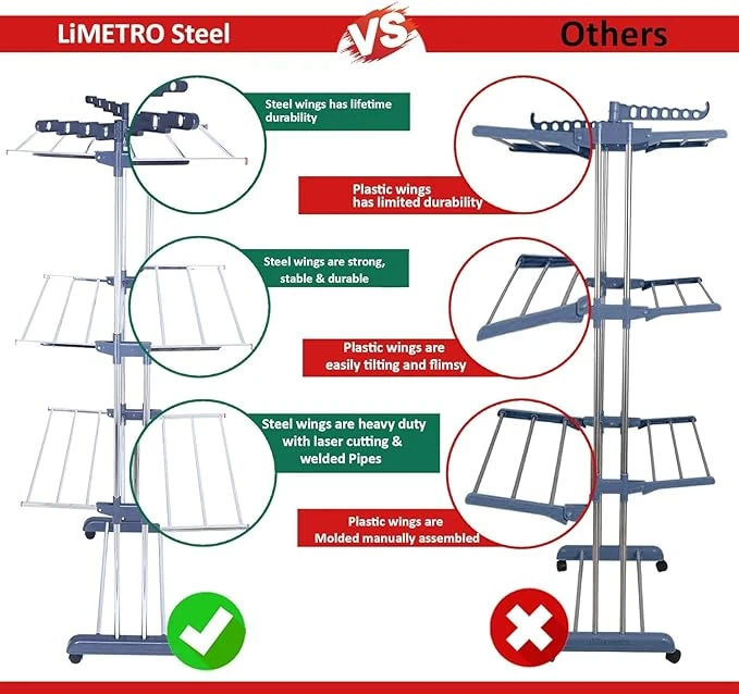 Limetro Steel 3 Layer Strainless Steel Clothes Stand for Drying, Cloth Drying stand, Cloth Stand For Drying Clothes with Foldable Wings, Cloth Drying Stand for Balcony with Wheels