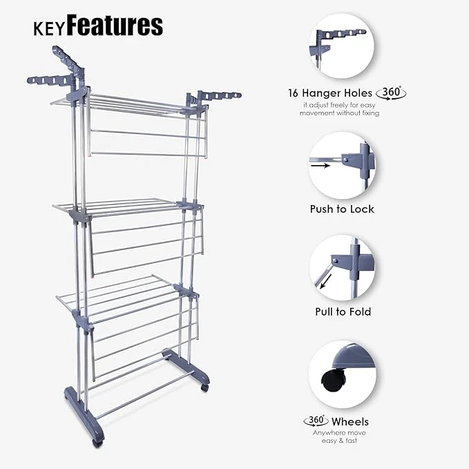 Collapsible, Detatchable and Movable Cloth Dryer Stand : This Limetro Steel Cloth Drying Stand has 3-Layers, 26 Rods, 6 Strong Foldable Stainless Steel Wings, 360-degree castor wheels which gives immense stability and strurdiness.