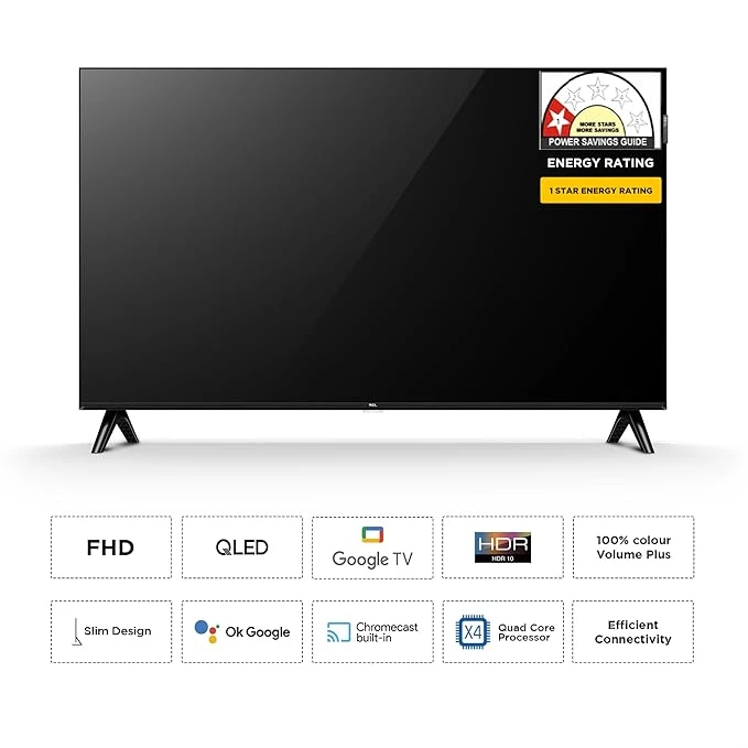 4. Smart TV Features: FHD QLED Google TV |1GB RAM | 8 GB ROM | 64-bit Quad Core Processor| Wi-Fi 4 | Google Assistant |Prime Video, Netflix, Hotstar, Zee5 and more| Web Browser | Screen Mirroring | Energy Rating: 1 Star | Annual Energy Consumption: 62 kWh