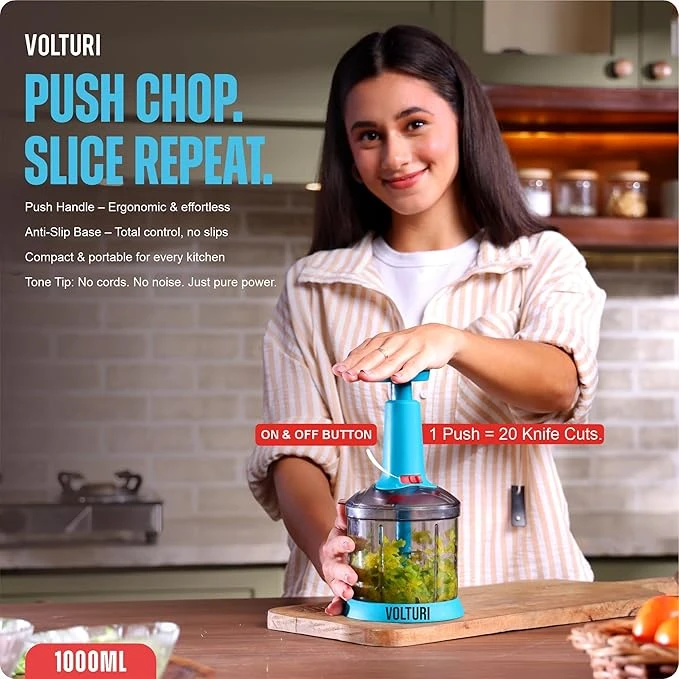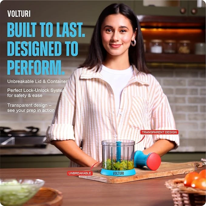 Powerful Push-Down Chopper for Effortless Cutting: Experience fast, uniform chopping with the VOLTURI push chopper designed for kitchen use. The sturdy stainless-steel blades deliver smooth performance for vegetables, onions, salad ingredients and nuts, making it the perfect vegetable chopper for kitchen tasks and daily meal prep.
